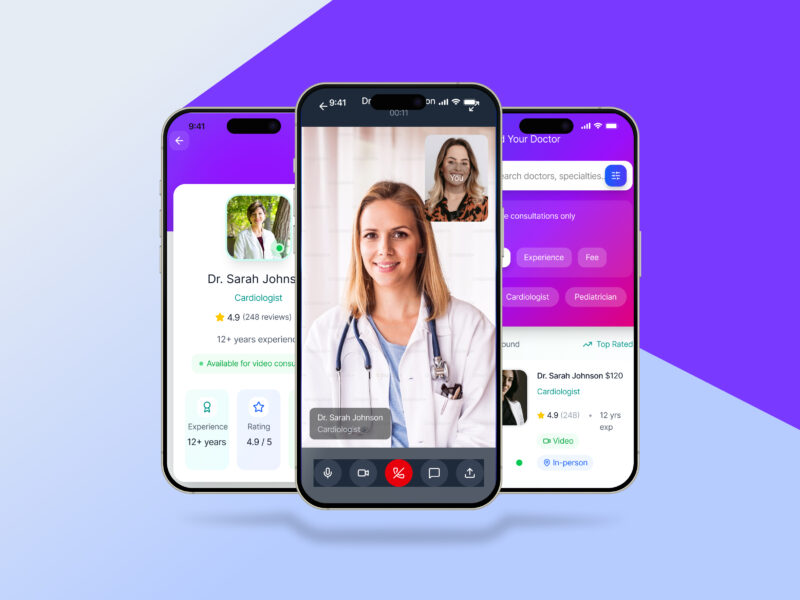 The design emphasizes a calm, modern healthcare experience through intuitive navigation, clear visual hierarchy, and accessible components. Every screen is crafted to guide users smoothly from search to consultation.